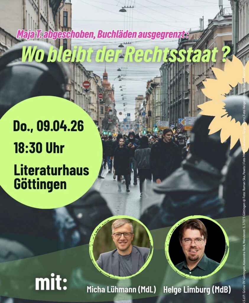 Beispiele einer besorgniserregenden Entwicklung gibt es genug. Die Göttinger Grünen haben dies zum Anlass genommen mich und unserer innenpolitischen Sprecher aus dem niedersächsischen Landtag, Michael Lühmann, einzuladen. Unter dem Titel „Maja T. abgeschoben, Buchläden ausgegrenzt – Wo bleibt der Rechtsstaat“ diskutierten wir im Literaturhaus Göttingen nicht nur über diese bedrohlichen Tendenzen. Es ging konkret auch darum, was wir tun können, um hier gegenzusteuern. Unter der Moderation von Johanna Stechmann aus dem Göttinger Stadtvorstand entstand nach einleitenden Ausführungen von Michael und mir eine lebendige Diskussion. Auch wenn es viele Gründe zur Sorge gibt, wurde im Laufe der Diskussion vielfach darauf hingewiesen, dass die demokratischen Kräfte und die Zivilgesellschaft zusammenstehen und sich auch diesen Angriffen entgegenstellen. Das ist auch von enormer Bedeutung. Denn was auf keinen Fall passieren darf: Dass wir uns an Angriffe auf den Rechtsstaat gewöhnen. Hier müssen wir jeder Normalisierung entgegenwirken, jeder Angriff gehört skandalisiert!